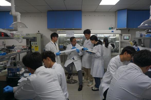解明(míng)教授(左二)與研究生(shēng)李孟俊(左一(yī))、沈華森(sēn)(右二)和(hé)田喻男(nán)(右一(yī)±)討(tǎo)論提升納米纖維隔膜性能(néng)